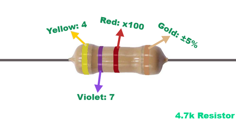 ±1% : The 4.7k resistance of this tolerance, shown below, is commonly used in high-precision circuits such as sensors and amplifiers.