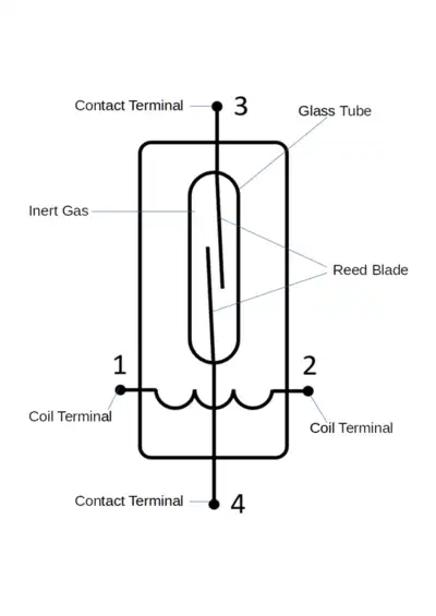 A reed switch is a device with two flattened ferromagnetic reeds, carefully sealed in a tube and controlled or made to make contact by an external magnet. It makes so much sense to say a reed relay is only a reed switch surrounded by an external coil controlled by an electrical signal.