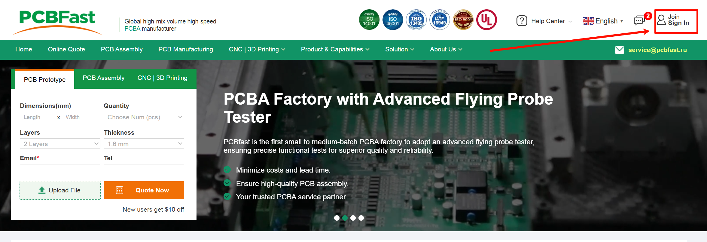 1.After entering PCBfast.com, please click on "Sign in" at the top right of the homepage or any page.