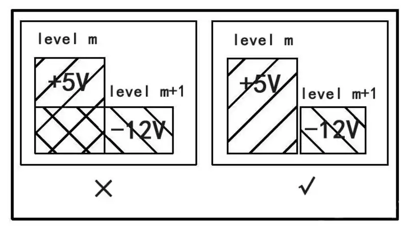 Different power planes should avoid overlapping in the same layer stack region to minimize coupling and interference between supplies—particularly when the voltages differ greatly. If overlap is unavoidable, PCBfast recommends inserting an intermediate ground plane for shielding.