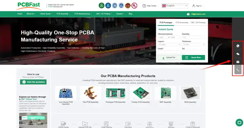 On the right side of each page of the PCBfast website, there is a fixed floating contact bar (including WhatsApp, WeChat, email, and phone number). Clicking on any of them will directly connect you with us.